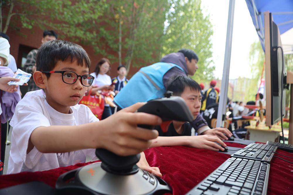 直升机与固定翼飞机真机吸引学生排队打卡;宇树机器人与机器狗与学生亲密互动;无人机飞行体验让孩子们化身为“航拍大师”;飞行模拟器让学生们仿佛置身真实的飞机驾驶舱;机甲大师格斗和超智能足球区域围满观众。模拟竞速赛车、VR体验、智能对弈机器人、3D打印机、激光雕刻机等项目同样人气爆棚。