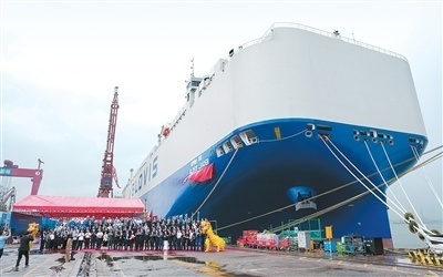 近年来,“中国制造”不断刷新“全球最大汽车运输船”纪录。2025年4月底,配置9200个标准装载车位的比亚迪“深圳号”出口首航;不到一个月,新的“海上霸主”产生,配置9500车位的“安吉安盛”轮于2025年5月首航。这两艘船均由我国船厂自主建造。