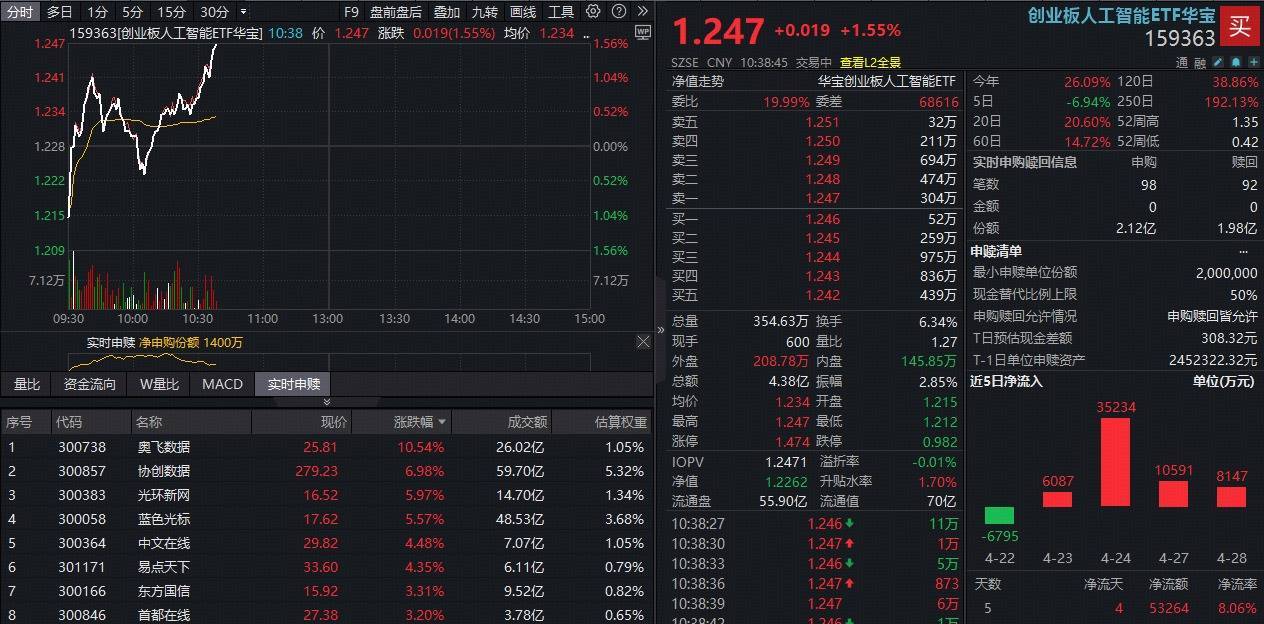 热门ET方面,同类规模、流动性第一的创业板人工智能ETF华宝(159363)场内上扬逾1%,资金近四日累计加仓6亿元。